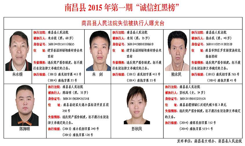 为倡导文明诚信,摒弃违法失信,维护司法尊严,营造公正严明的司法氛围,南昌县文明办联合南昌县人民法院公布南昌县2015年第一期“诚信红黑榜”失信执行名单。